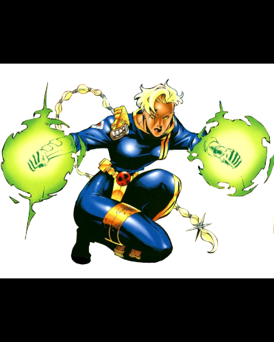 While her brother became a mainstay with their childhood heroes, she wasn’t so lucky. Introduced in Uncanny X-Men Annual #17 (1993) by Scott Lobdell and Jason Pearson, Shard is the younger sister of the X-men member Bishop. She grew up in the same future where the X-men were betrayed by one of their members and the government began capturing and branding mutants. They were eventually recruited by the XSE (Xavier Security Enforcers) in a effort to train mutant and show the world that they could police themselves. They both rose through the ranks with Shard becoming the youngest commanding officer in the history of the organization. However, she was set up by Trevor Fitzroy, her boyfriend, into an ambush with the Emplate, transforming into one of them and having to siphon off mutant energy to survive. Bishop was forced to kill his sister rather then let her live as a monster…….But she would survive somewhat as her essence was transferred to a crystal in Bishop’s bracelet allowing her to live as a hologram so when Bishop went back in time to follow her boyfriend, she went with him.
