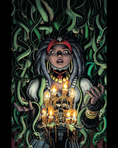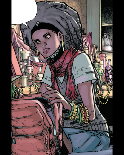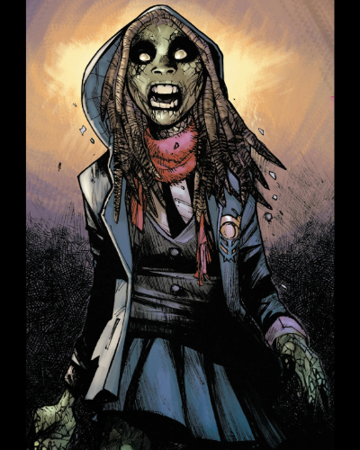 She is the Zombie wizard of Strange Academy. Introduced in Strange Academy #1 (2020) by Skottie Young and Humberto Ramos, Zoe comes from a long-line of magician but Zoe struggled with her magic causing her to fall into depression, fearing she would end their family line. This cause her to seek aid from Gaslamp, a dark mage who sold her a wish to boast her powers. However, the power fade and she kept going back to Gaslamp. The effect on her bpdy cause her to die. Her parents with to the grave of Marie Laveau, their ancestor and voodoo priest. The spirit of Marie resurrected Zoe but the damage to her body cause her to take a Zombie appearance. She had to wear an amulet to hide her appearance.